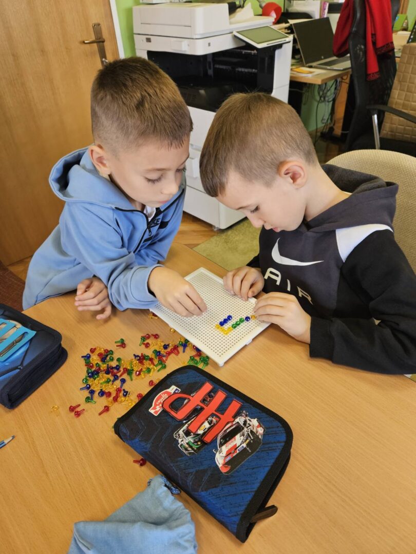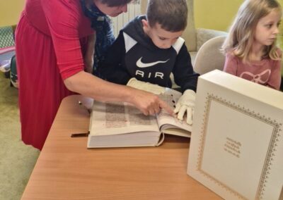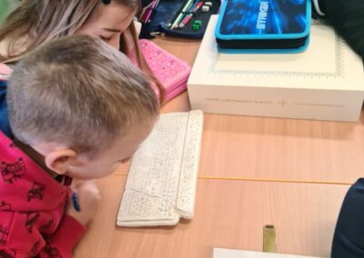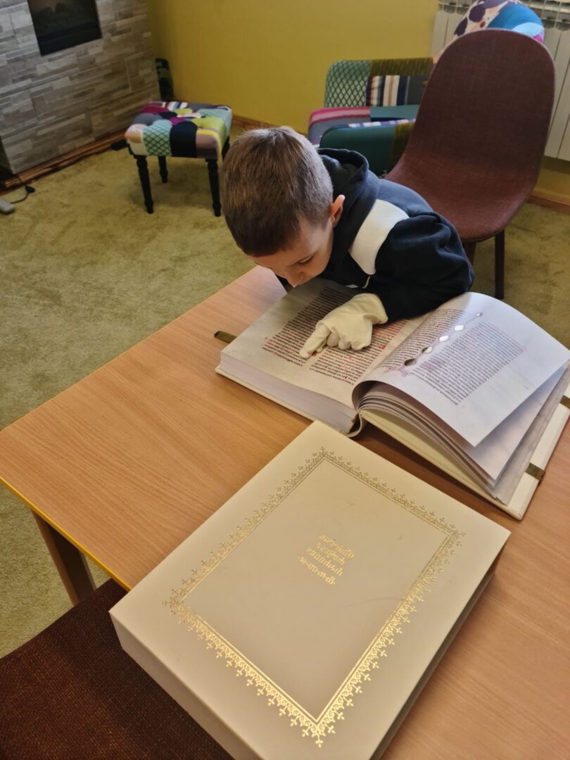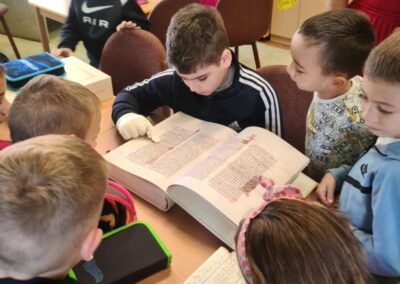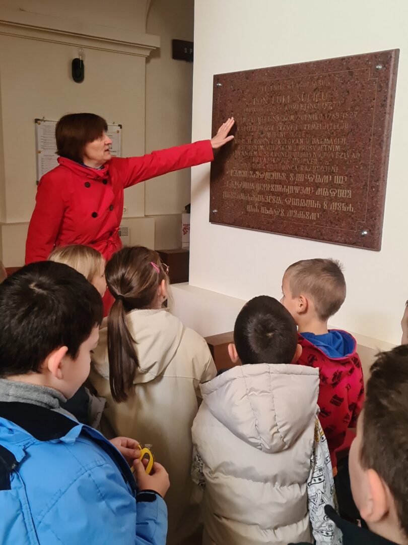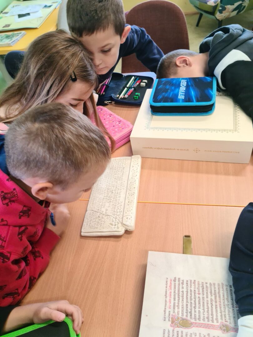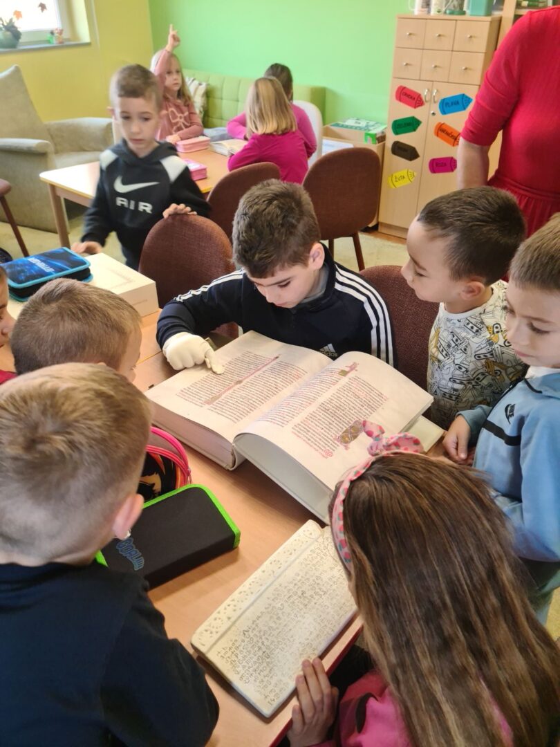 U sklopu školskog projekta „Odavno smo Gagulani stari“ danas su naši učenici 1. razreda zasukali rukave i krenuli u potragu za glagoljicom! Najprije su u knjižnici sa školskom knjižničarkom Katicom Novoselac prolistali pretiske vrijednih knjiga pisanih odnosno tiskanih glagoljicom i to u rukavicama kako bi se vrijedne knjige čuvale od oštećenja. A pokušali su čitati i Baščansku ploču. Zatim su „crtali“ glagoljička slova, a onda krenuli u park pod lipama tražiti izgubljena slova. Navratili su i u našu crkvu i poslušali kratku priču o dva komletinačka svećenika kojima su posvećene ploče pisane glagoljicom u crkvi i na pročelju škole. Na kraju su se okušali u „klesanju“ glagoljice – bockali su svoje inicijale glagoljičkim slovima. Na odlasku iz knjižnice knjižničarku su pozdravili: „Doviđenja, glagoljice!“